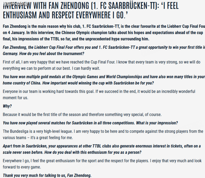 德甲发问:樊振东,你即将携手萨尔布吕肯俱乐部出战德国杯半决赛。同时,这也为你创造了一个绝佳机会——争夺在德国打球的首个冠军。你对于这项赛事有何感受?